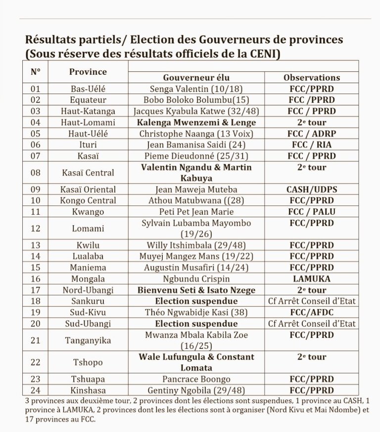 Au Tanganyika, le discours de campagne ahurissant du candidat du FCC, Zoé Kabila, ne l’a pas empêché de rafler la mise devant le charismatique Christian Mwando, qui aurait sans nul doute été le meilleur gouverneur de cette jeune province. Dans le Haut Lomami, Kalenga Mwenzemi sera opposé à Lenge au second tour, comme au Kasai Central, où Valentin Ngandu sera face à Martin Kabuya.