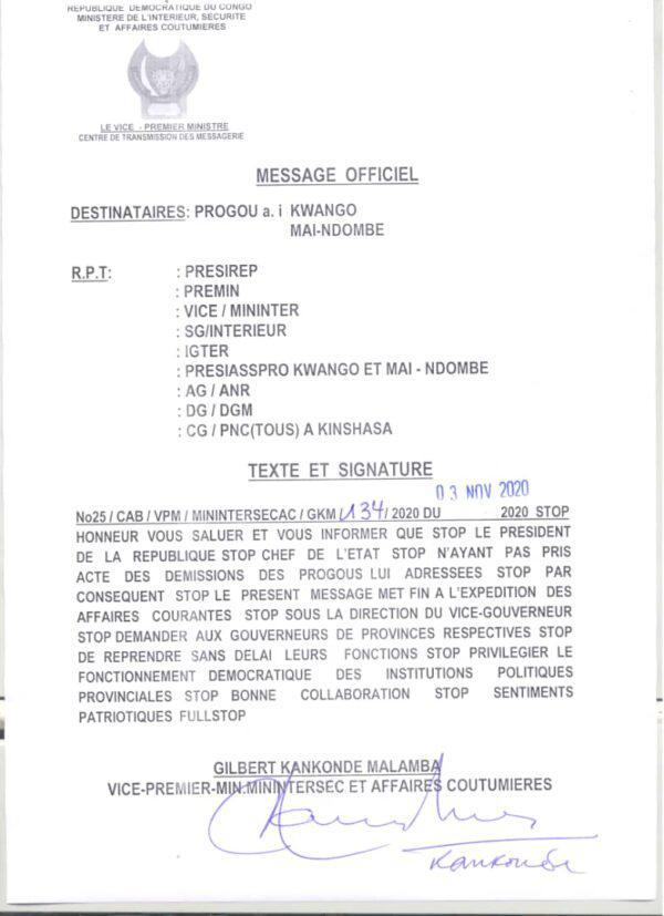 Selon le télégramme du ministre Gilbert Kankonde, le Président de la République n’a pas pris acte de leur démission, ce qui, selon lui, justifie amplement leur réhabilitation.