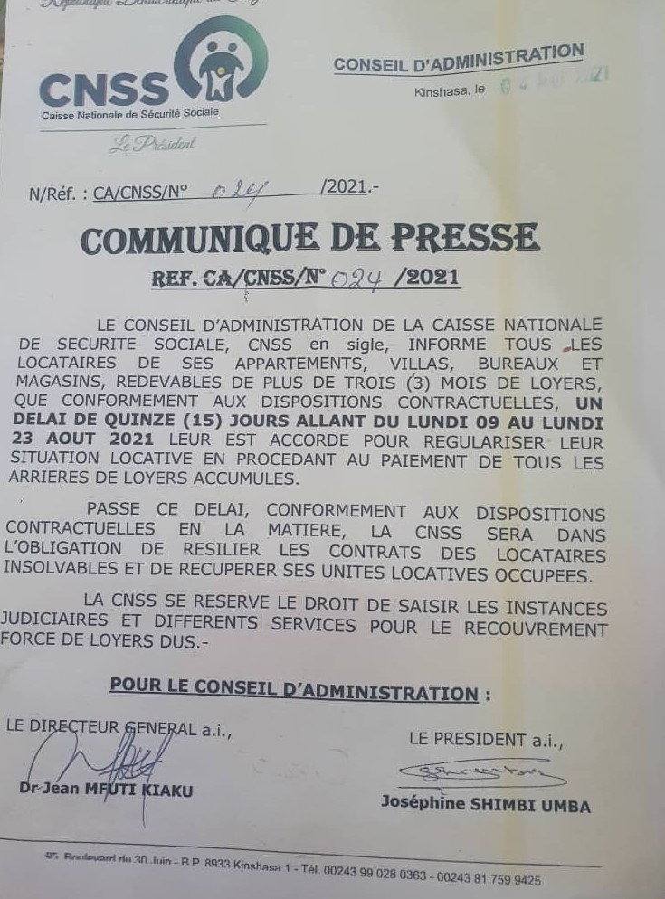 La Caisse nationale de sécurité sociale (CNSS) vient de lancer une mise en demeure de 15 jours aux locataires insolvables qui occupent ses appartements, villas, bureaux et magasins, soit du lundi 9 au lundi 23 août 2021 pour solder les arriérés de loyers accumulés.