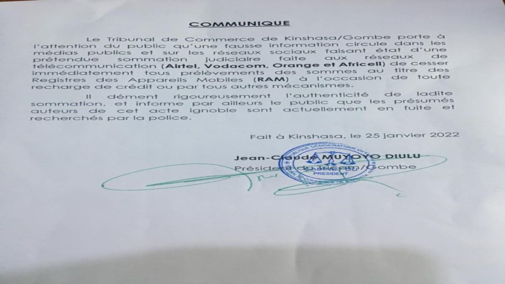 Le Tribunal de Commerce de la Gombe à Kinshasa, a vigoureusement démenti mardi la sommation faite aux quatre opérateurs de la téléphonie mobile en Rdc, de ne plus prélever la Taxe Ram.