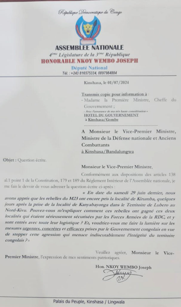 Notons que le député national Nkoy Wembo n’est pas à sa première interpellation d’un ministre sur la question de la sécurité et dans l’est du pays. Le 1er juillet, il avait déjà adressé une question écrite au Vice-Premier ministre et ministre de la Défense nationale et Anciens Combattants, après la chute de Kirumba et de Kanyabayonga.