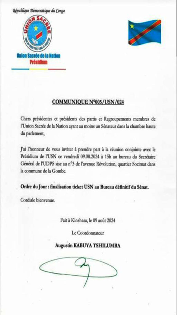![union-sacree-pour-la-nation[1] Présidium de l'Union sacrée pour la Nation](https://infocongo.net/wp-content/uploads/2024/08/union-sacree-pour-la-nation1.jpg)